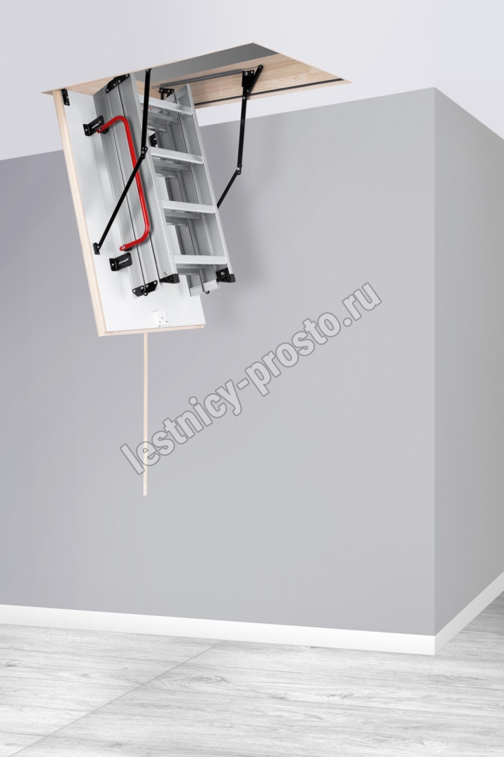 Складная 3-х секционная (до 2800 мм) или 4-х секционная (до 3500 мм) чердачная лестница. Рабочая поверхность полностью выполнена из алюминия. Термоизоляционная крышка типа "сэндвич" имеет усиленную теплозащиту, облицована с двух сторон ДВП белого цвета. По контуру короба имеется уплотнитель;