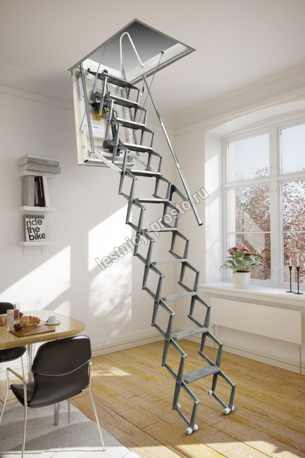 Лестница на мансарду или чердак автоматическая с пультом дистанционного управления