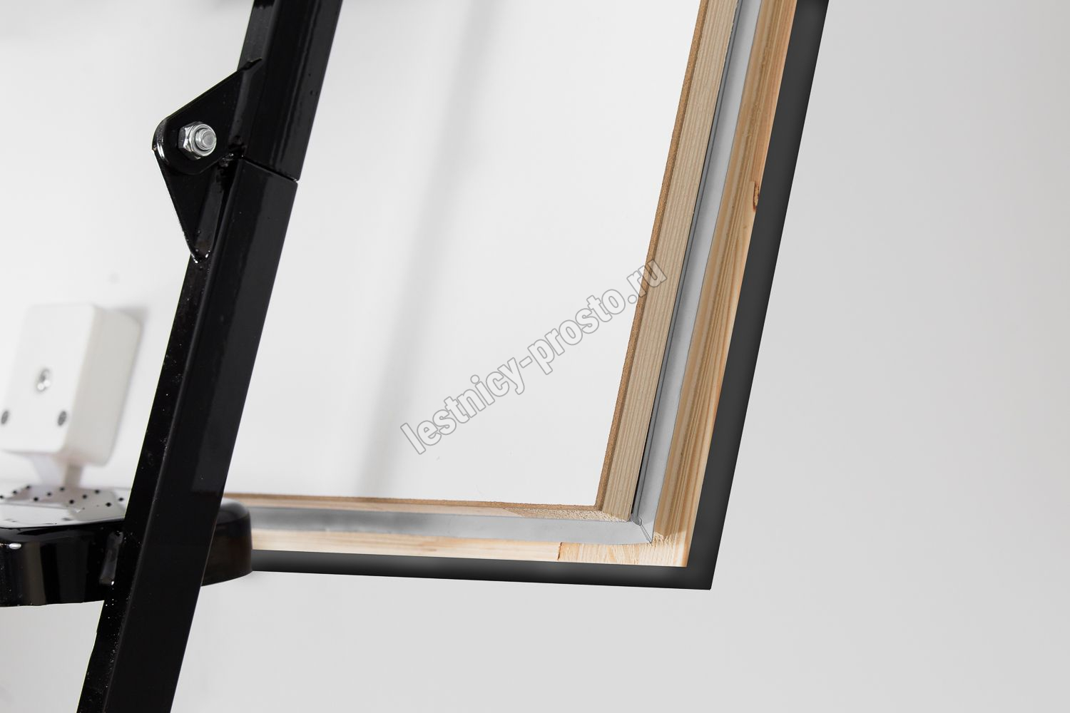Противопожарная лестница, огнестойкость EI 60 Лестница чердачная складная металлическая 3-х секционная. Ступени полностью выполнены из металла и покрашена порошковой краской. Термоизоляционная крышка типа “сэндвич “, толщиной 66мм, утеплена пенопластом , облицована с двух сторон ДВП белого цвета. Короб деревянный высотой 170мм. Лестница имеет 3 уплотнителя, один проходит по периметру короба, и два по периметру крышки люка, в том числе и противопожарный.