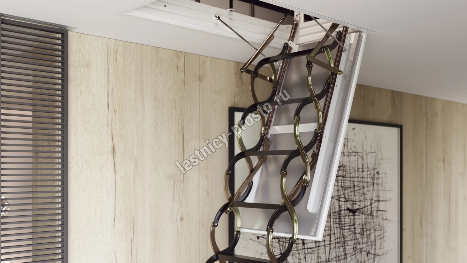 Сертифицированная, противопожарная лестница, огнестойкость: EI1 20 / EI2 60 / EW 60. Лестница чердачная, раздвижная, ножничного типа, работает по принципу сжатия. Крышка лестницы представляет собой многослойную конструкцию – деревянная рама, внутри которой находится теплоизоляция и противопожарная вставка. Внутренняя часть крышки покрыта оцинкованной жестью, наружная часть белой эмалью и защитной пленкой. Толщина крышки 60мм. Лестница предназначена для установки в утепленное чердачное помещение, где колебание температуры не превышает 10 градусов. Все соединяющие части изготовлены из твердого материала и имеют оцинкованное покрытие. Короб металлический высотой 140мм. по периметру проходит уплотнитель.