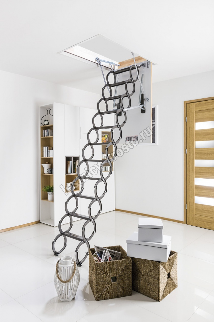 Металлическая чердачная лестница LST оснащена энергосберегающей термоизоляционной крышкой люка белого цвета. По периметру люка установлен контур уплотнения, обеспечивающий высокую степень герметичности. Благодаря «ножничной» системе складывания в сложенном виде лестница очень компактна и имеет небольшой размер крышки люка. S-образные боковые элементы лестницы выполняют роль поручней и придают лестнице современный вид.