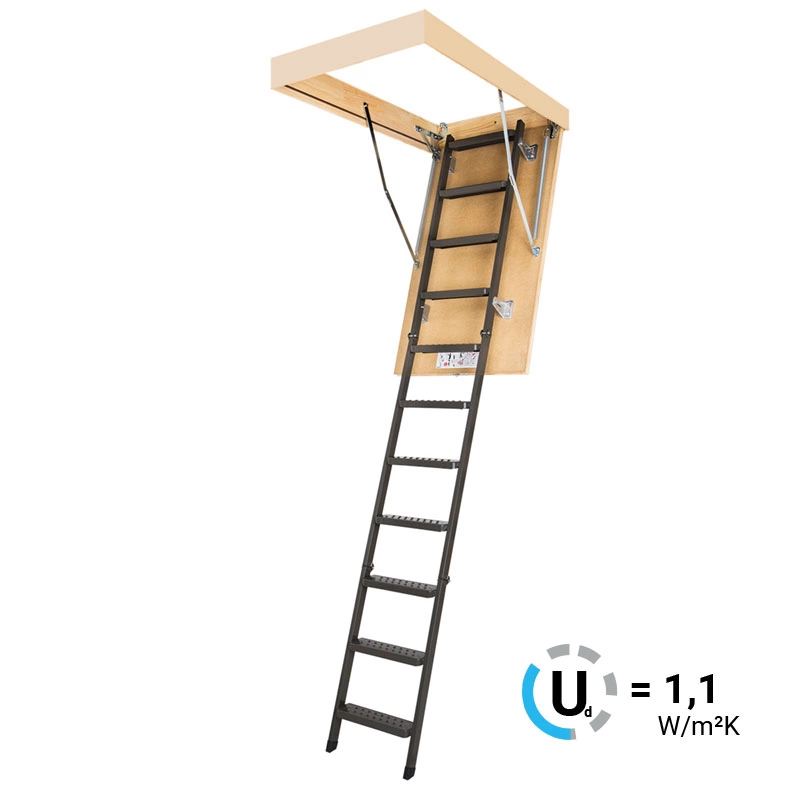 Лестница складная трехсекционная. Рабочая поверхность полностью выполнена из металла и покрашена порошковой краской. Термоизоляционная крышка типа "сэндвич", толщиной 47 мм, утеплена пенопластом, облицована с двух сторон ДCП белого цвета.