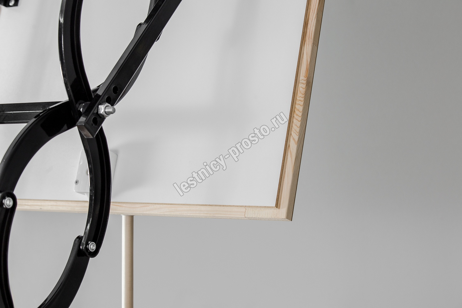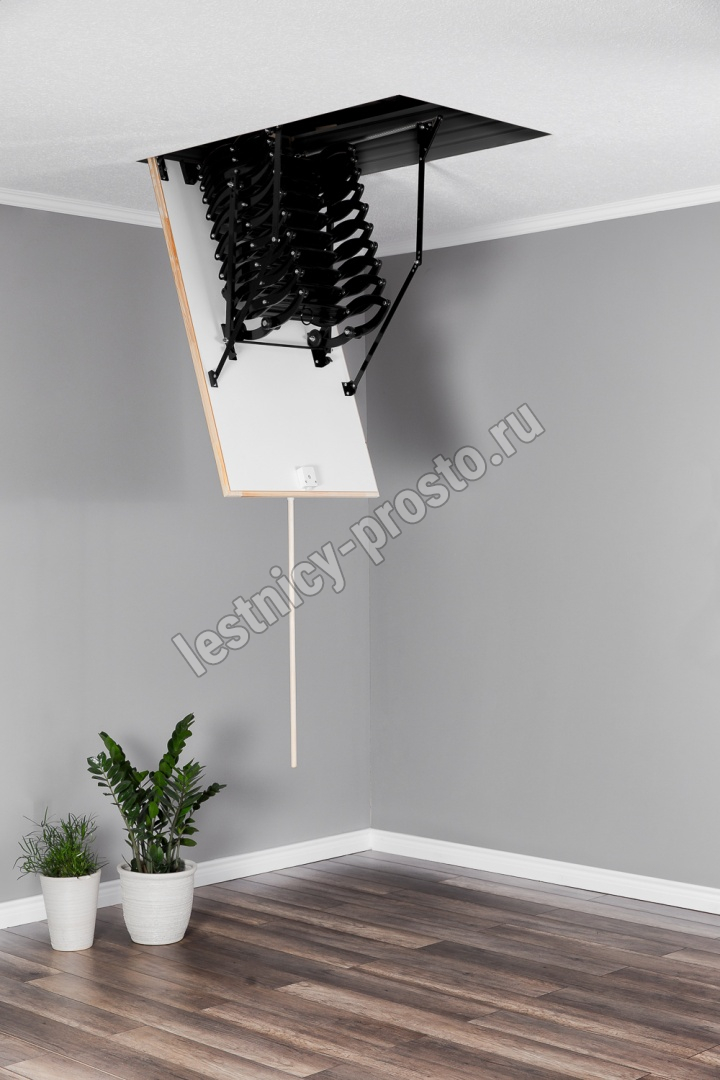 Все элементы лестницы выполнены из экологически чистых материалов и обработаны веществами, не содержащими тяжелых металлов. На ступенях антискользящие насечки. Короб лестницы изготовлен из металла. Термоизоляционная крышка типа "сэндвич" утеплена пенопластом, облицована с двух сторон ДСП белого цвета. Короб люка с уплотнителем. В комплекте деревянный стержень для открывания лестницы.