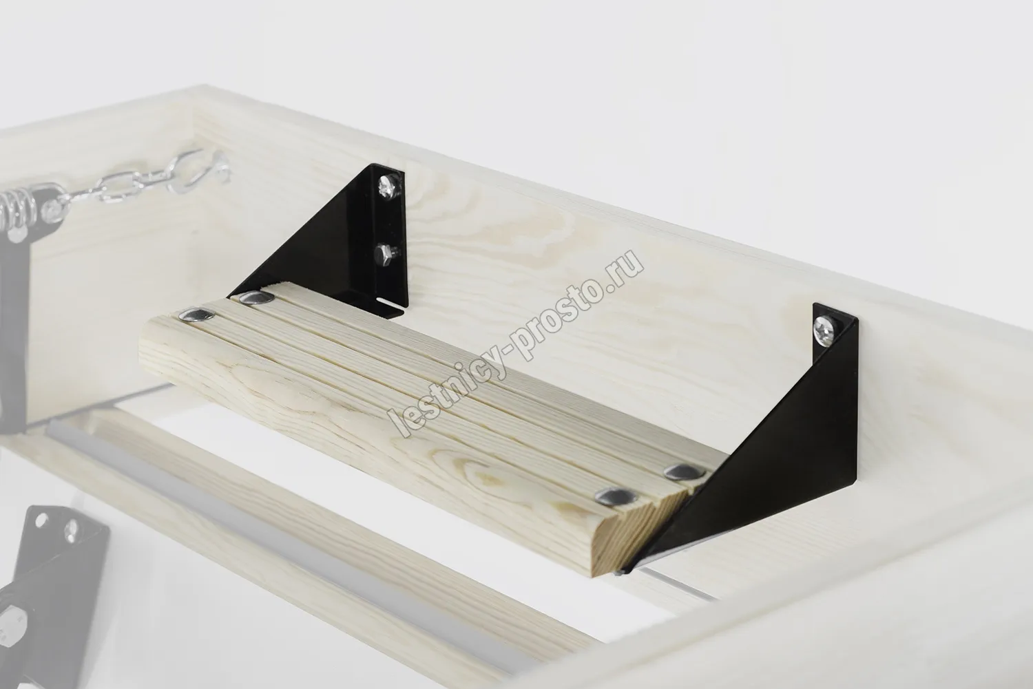 Лестница чердачная, складная, комбинированная 3-х секционная, металлические направляющие/деревянные ступени. Короб люка имеет двухточечную систему запирания. Телескопический поручень имеет внутреннюю пружину и при складывании лестницы служит механическим приводом, что облегчает процесс. Делает его полуавтоматическим. Оборудована дополнительной ступенькой на люке помогающей комфортно подниматься и спускаться. Термоизоляционная крышка типа "сэндвич", толщиной 86мм, утеплена пенопластом, облицована с двух сторон ДВП белого цвета. Лестница подходит для установки в местах с большими перепадами температур. Короб деревянный, высотой 170мм., по периметру проходит уплотнитель. Лестница выпускается для немецкого и английского рынка.