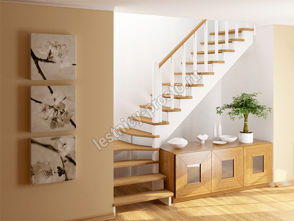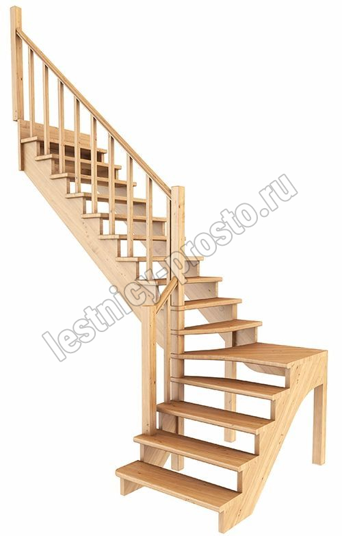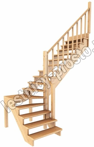 Ступени и поручень лестницы выполнены из бука, остальные элементы из сосны. Возможно изготовление данной модели полностью из бука. Базовый комплект включает в себя деревянные элементы лестницы и ограждения без какого-либо покрытия.