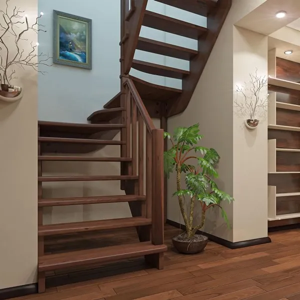 Ступени лестницы состоят из металлической рамки, обеспечивающей необходимую прочность, и покрытия из террасной доски ДПК (древесно-полимерный композит). Ступени не боятся воды и мороза, не теряют со временем свой внешний вид и не требуют ухода.