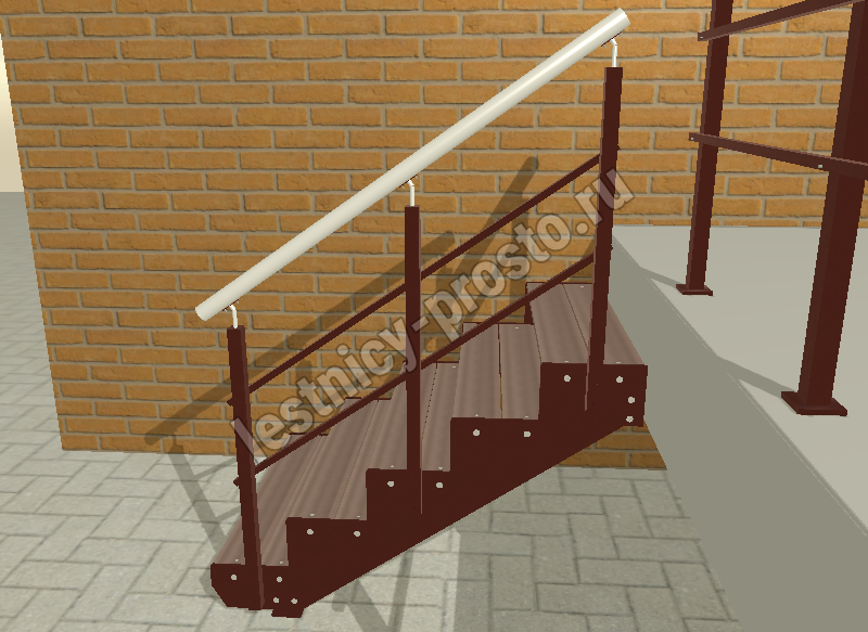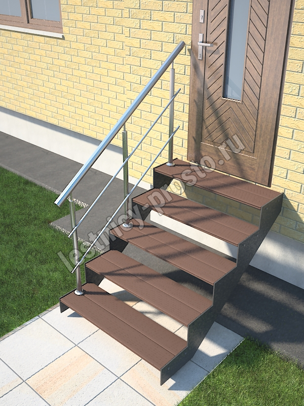 Надежный красивый каркас из толстого стального листа толщиной 8мм с оригинальным дизайном. Покрытие порошковое, очень прочное и долговечное. Все детали каркаса крепятся с помощью болтов, благодаря чему Вы можете собрать каркас самостоятельно без применения сварки. Ступени лестницы состоят из металлической рамки, обеспечивающей необходимую прочность, и покрытия из террасной доски ДПК (древесно-полимерный композит). Ступени не боятся воды и мороза, не теряют со временем свой внешний вид и не требуют ухода. Под заказ, возможно изготовление ступеней из других материалов, таких как: рифленая сталь, лотки под плитку, решетчатый настил, дерево. Базовое ограждение: крашеное или из полированной нержавеющей стали.