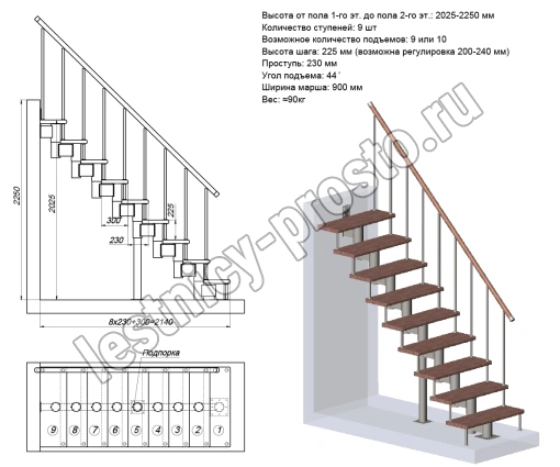 Модульная лестница PROSTO Module прямая/ h225 см