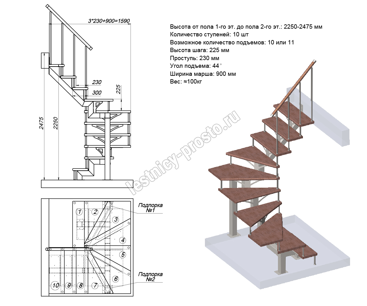 | Лестница PROSTO MONO П-образная, h270 см, ступени хвоя |