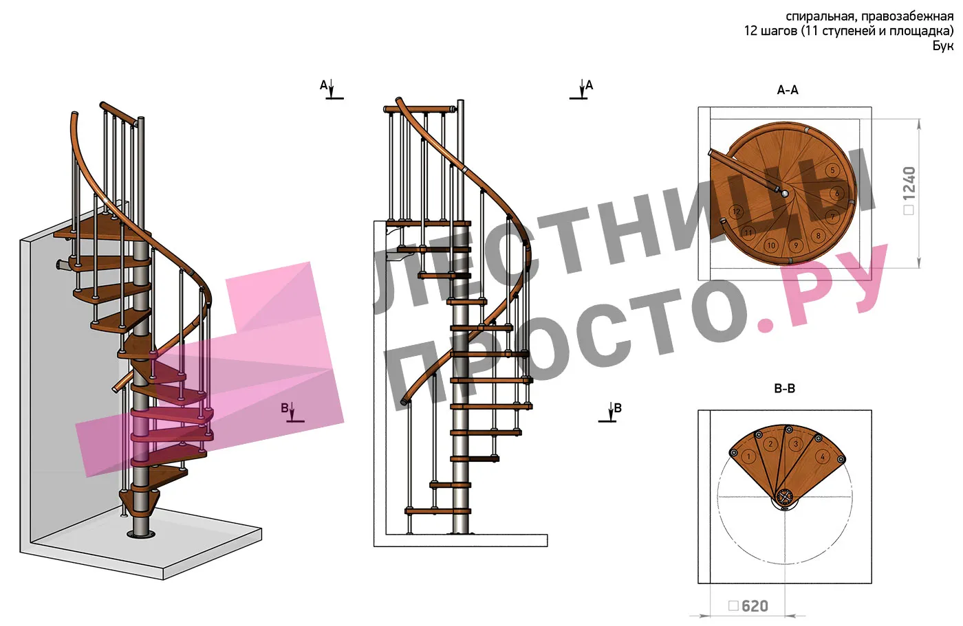 Винтовая лестница Prosto Spiral White D120см, h260.5-304.6 см, бук