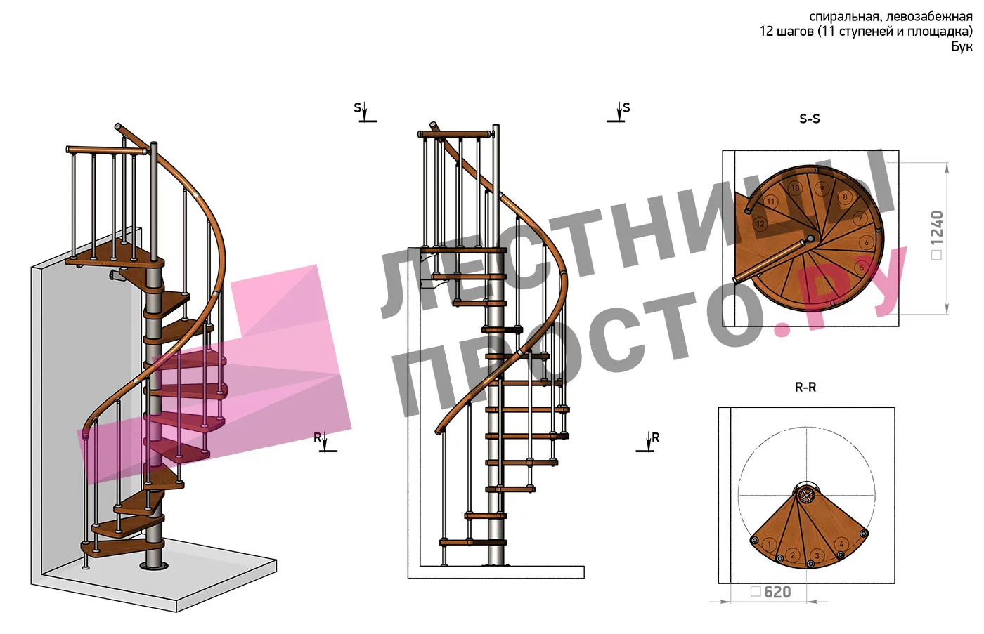 | Винтовая лестница Prosto Spiral White D120см, h282.2-326,3 см, бук |