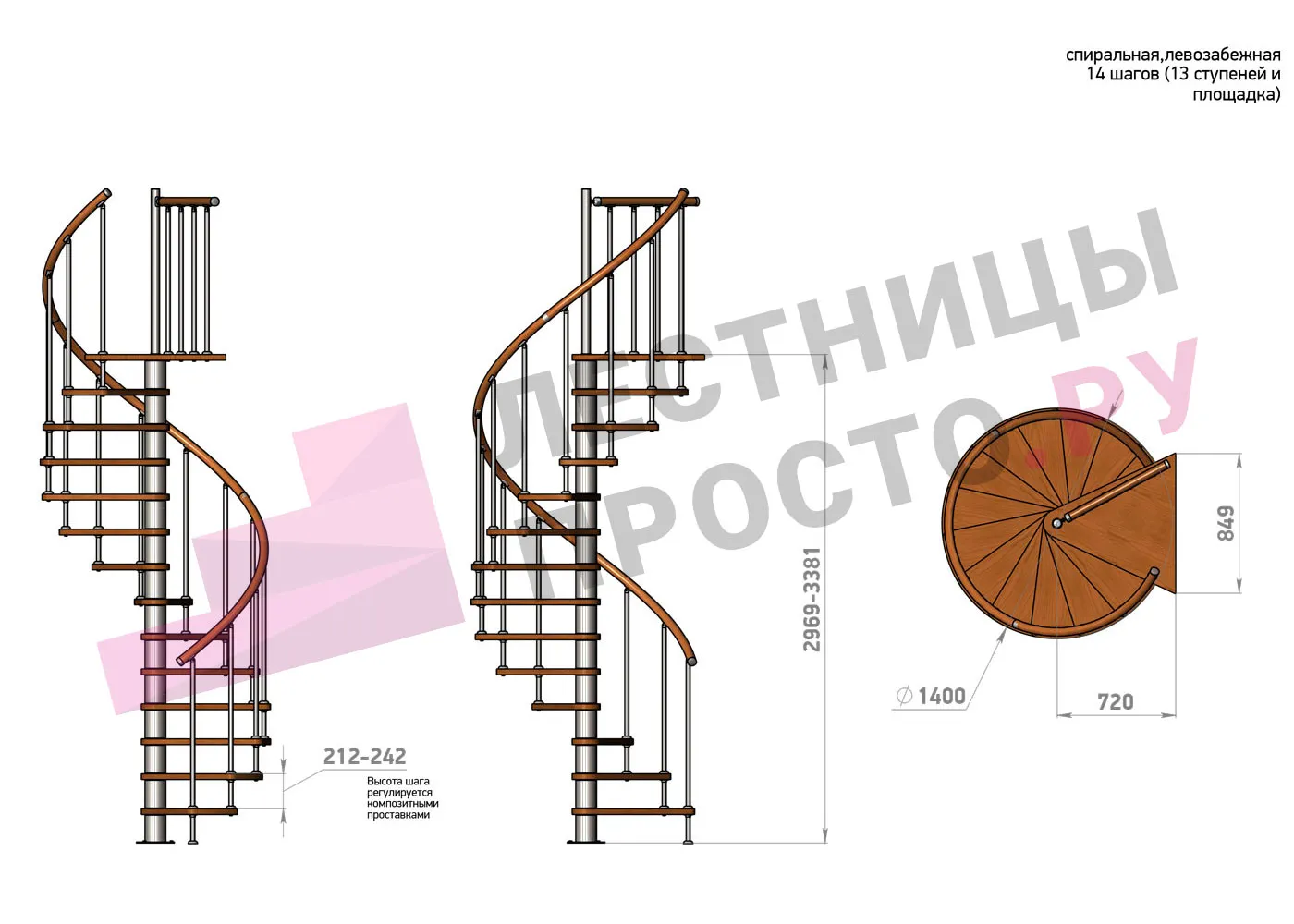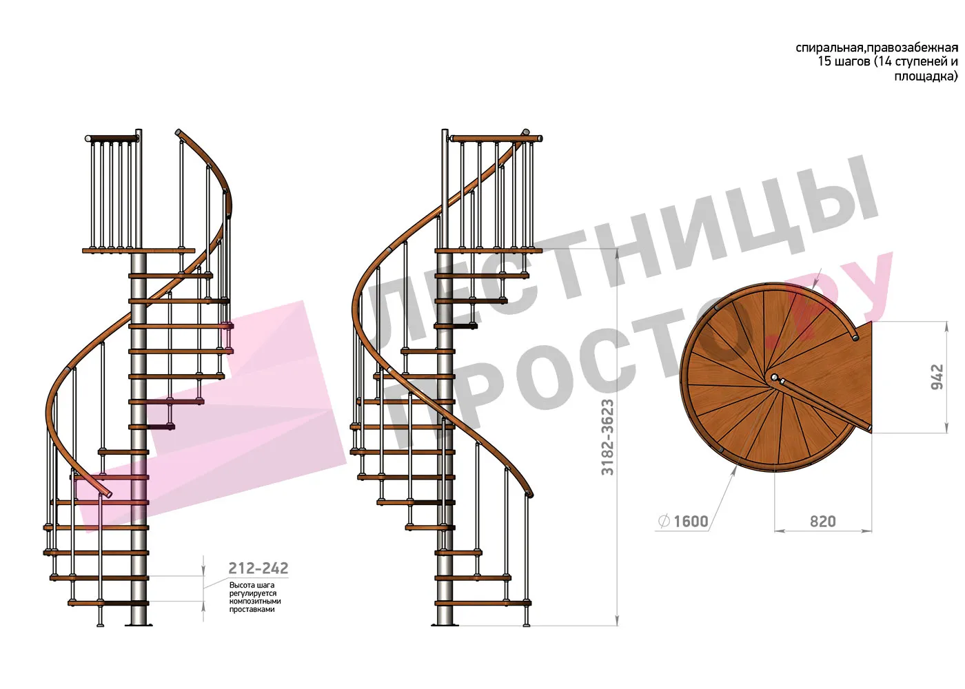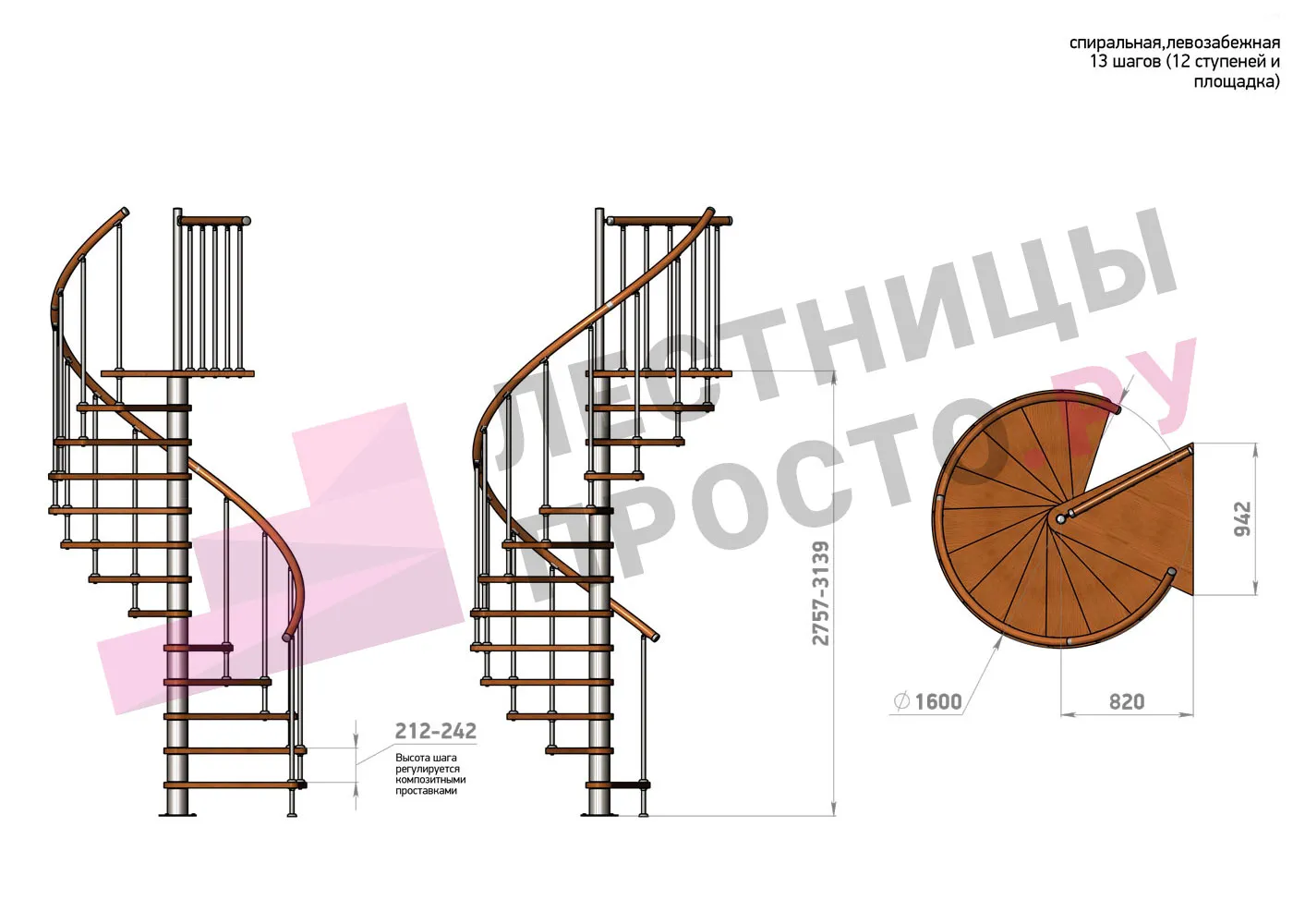 Высота ступеней регулируется с шагом 3 мм. в пределах 212-242 мм., благодаря чему, лестница прекрасно подгоняется под необходимую высоту.